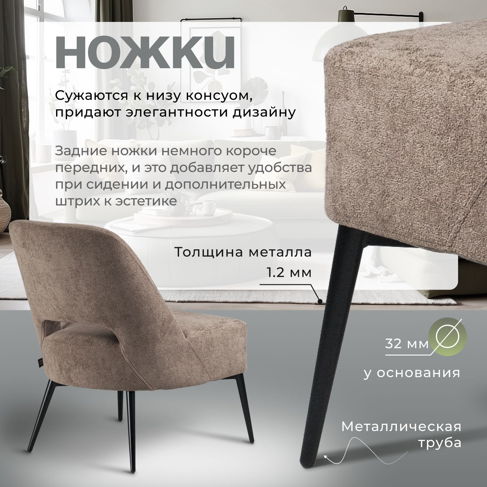 • Мягкость и фактура: По составу ткань напоминает велюр, но с текстурой, имитирующей букле. Это кресло букле приятно на ощупь и выглядит эффектно в любом пространстве.