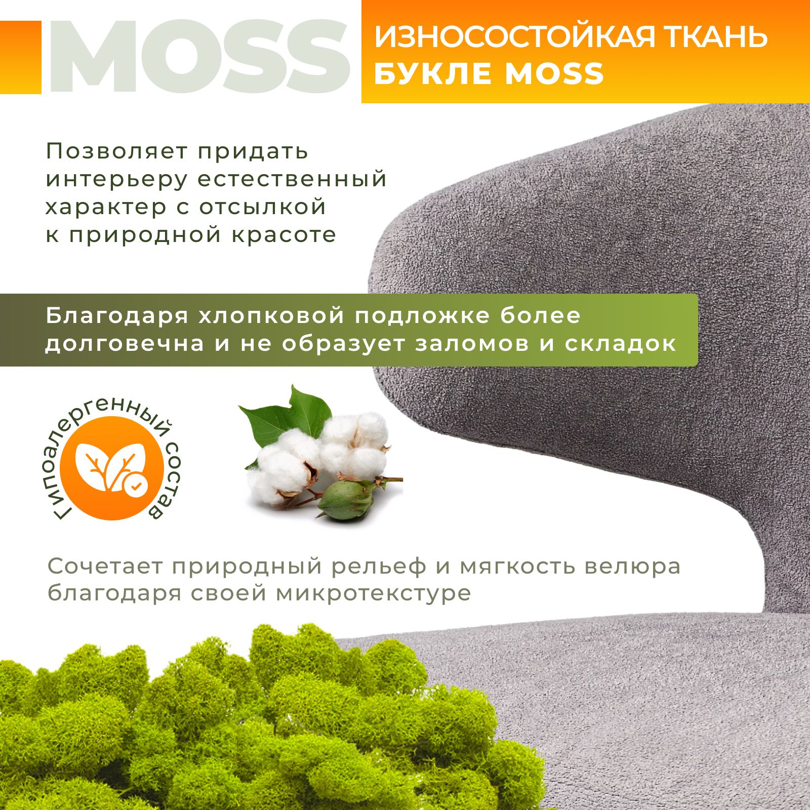 • Мягкость и фактура: Обивка из ткани Moss с антикоготь-эффектом сочетает в себе мягкость велюра и фактурность букле, создавая стильный и современный вид. Это кресло букле приятно на ощупь и идеально для ежедневного использования.