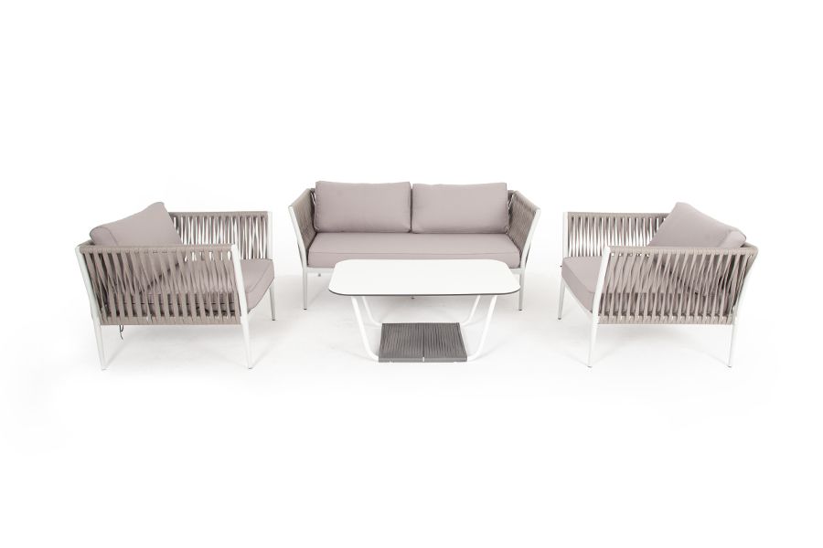 Журнальный столик также имеет алюминиевый каркас белого цвета. Столешница выполнена из монолитного компакт-пластика HPL молочного оттенка. Нижняя часть столика задекорирована роупом серого цвета и представляет дополнительную полку для хранения. "Касабланка" кресло плетеное из роупа (веревки) 2шт. 850Х800Х700, "Касабланка" диван плетенный из роупа, двухместный 1шт. 1 600Х800Х700, "Глория" журнальный стол 100х65см из HPL, цвет молочный 1шт. 1 000Х650Х420,