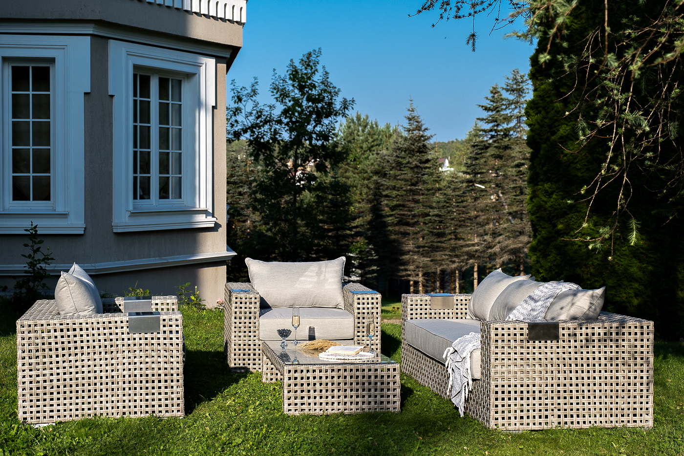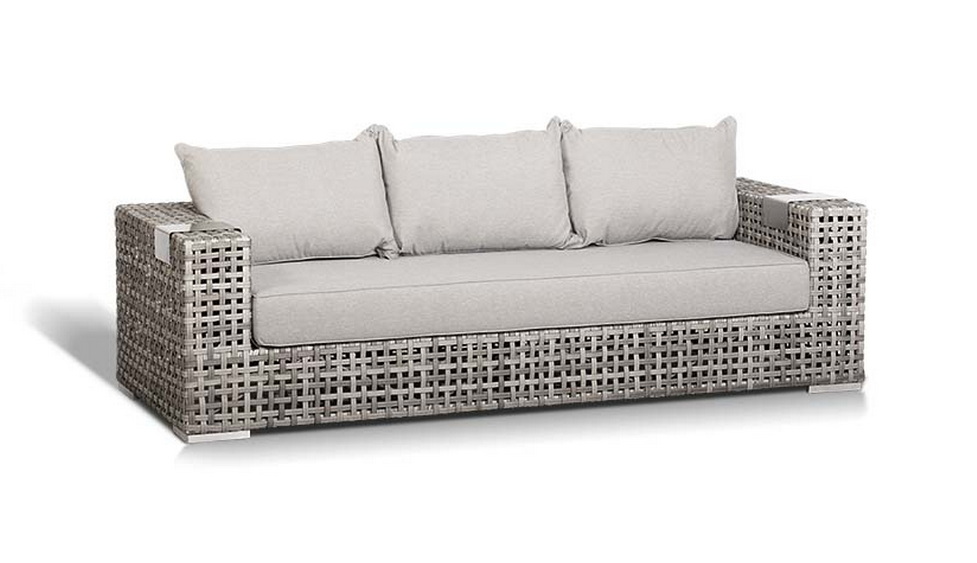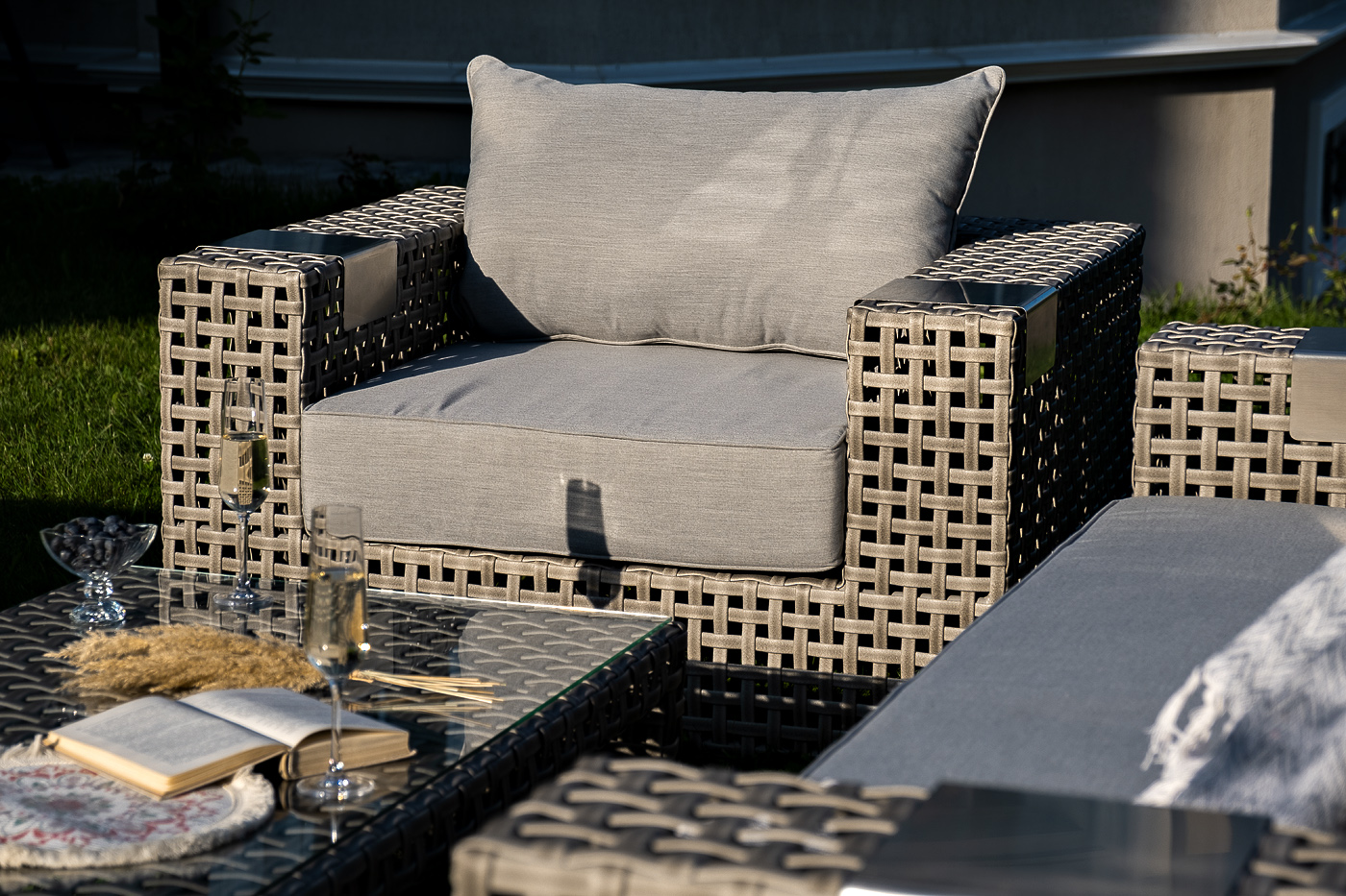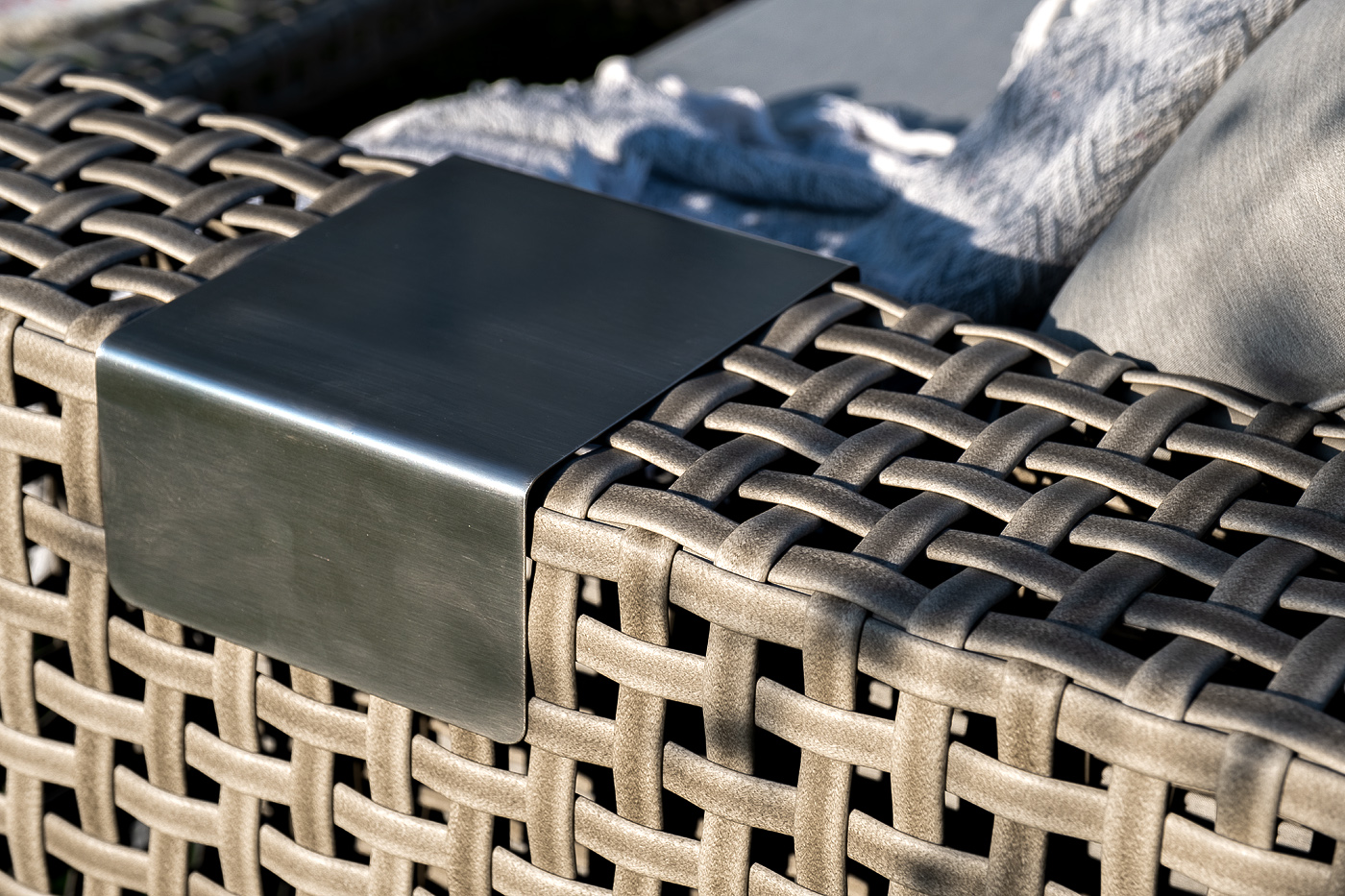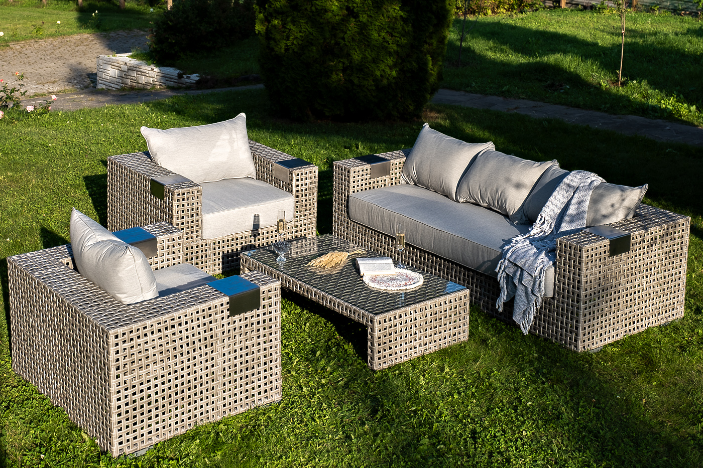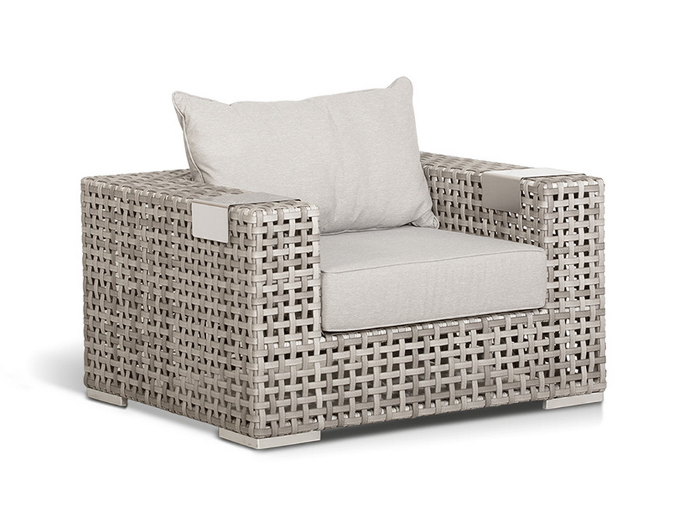 Подлокотники плетеного дивана и кресел оснащены алюминиевыми подставками, на которые можно поставить бокал или тарелку.