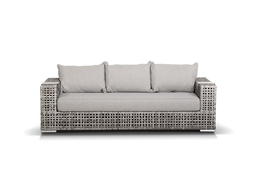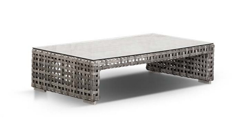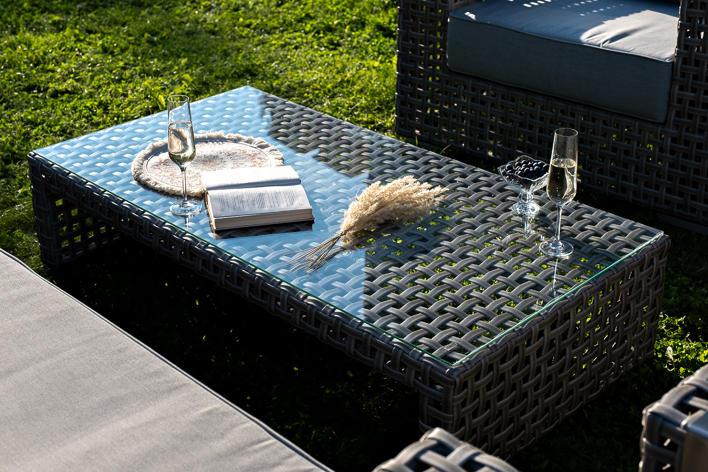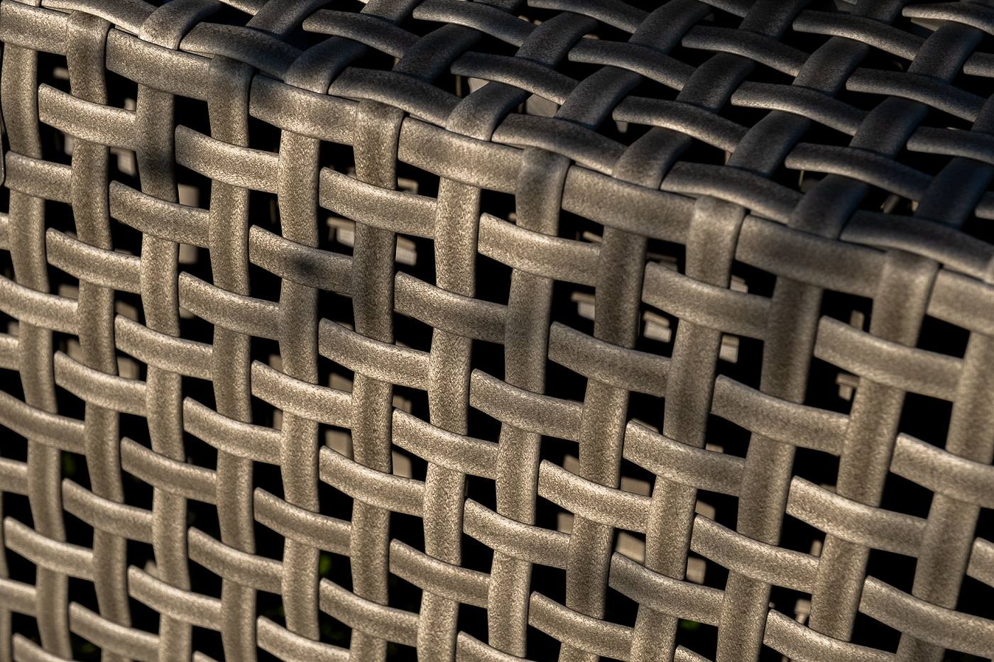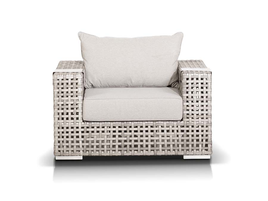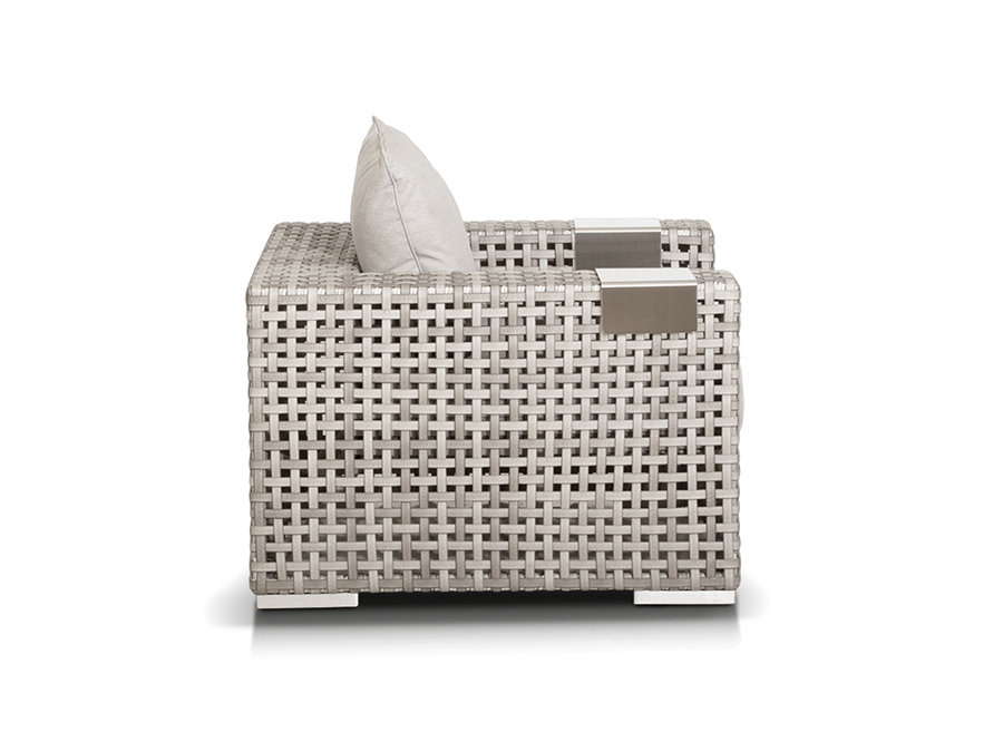 Корпус мебели изготовлен из прочного алюминия и оплетен вручную плоским искусственным ротангом. Цвет серый.
