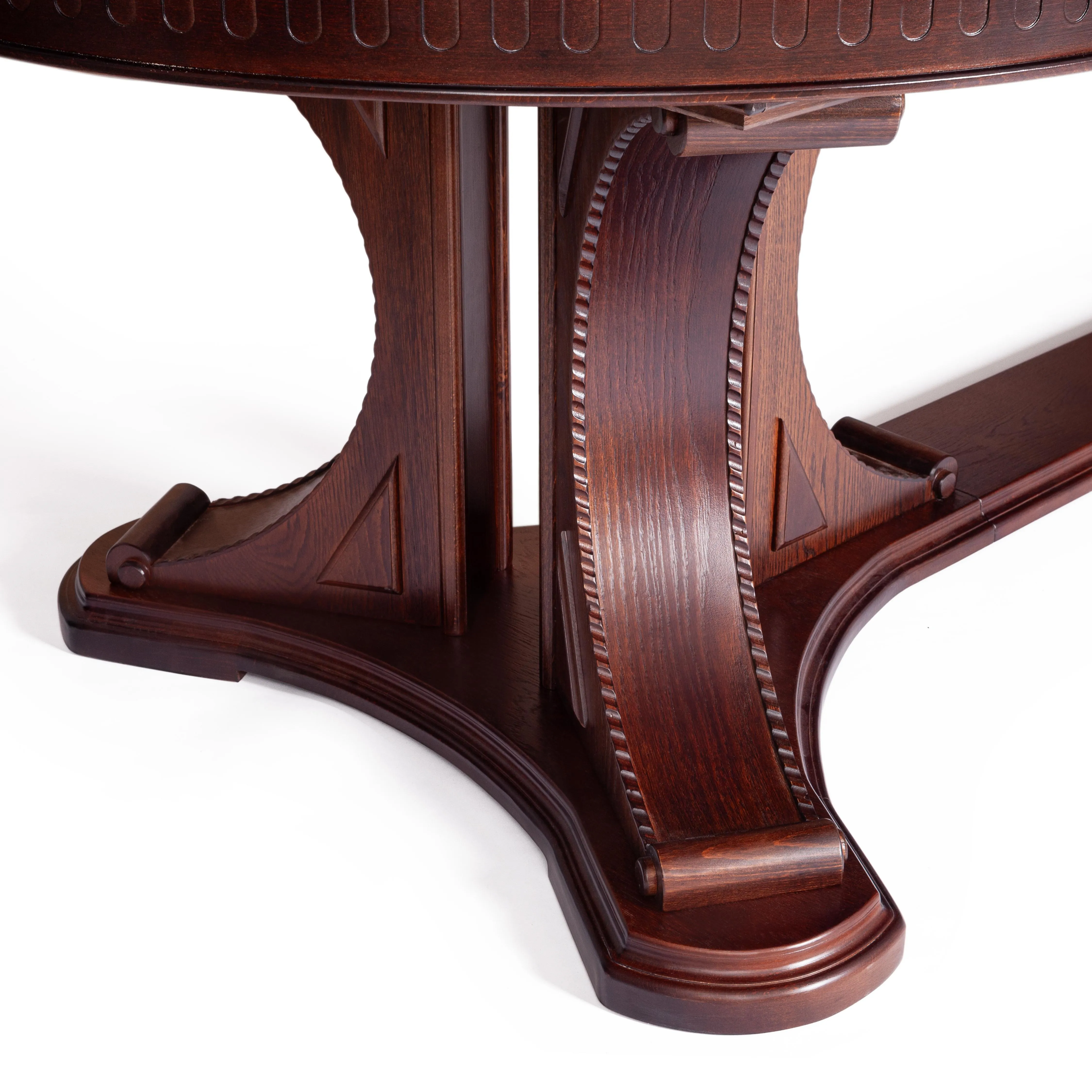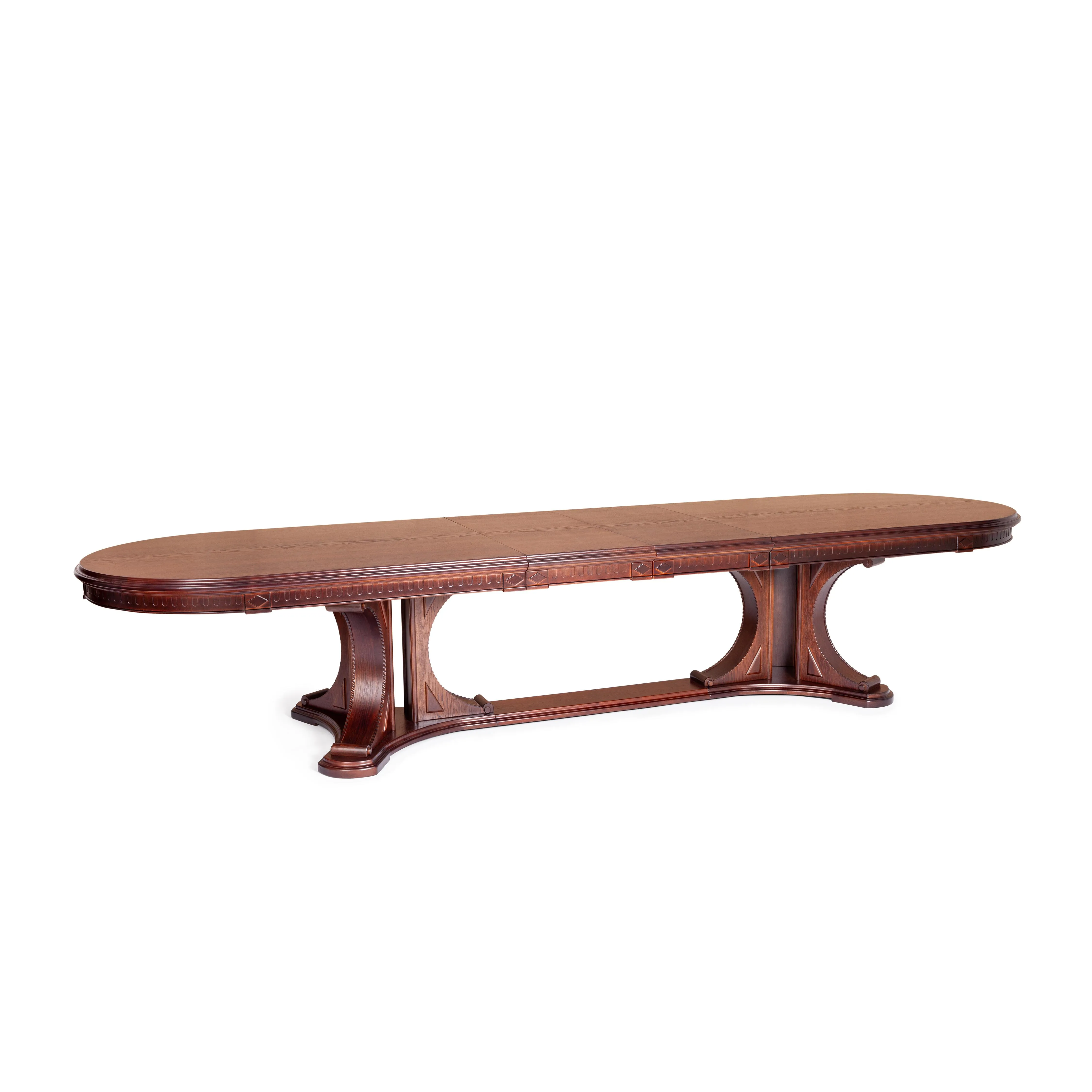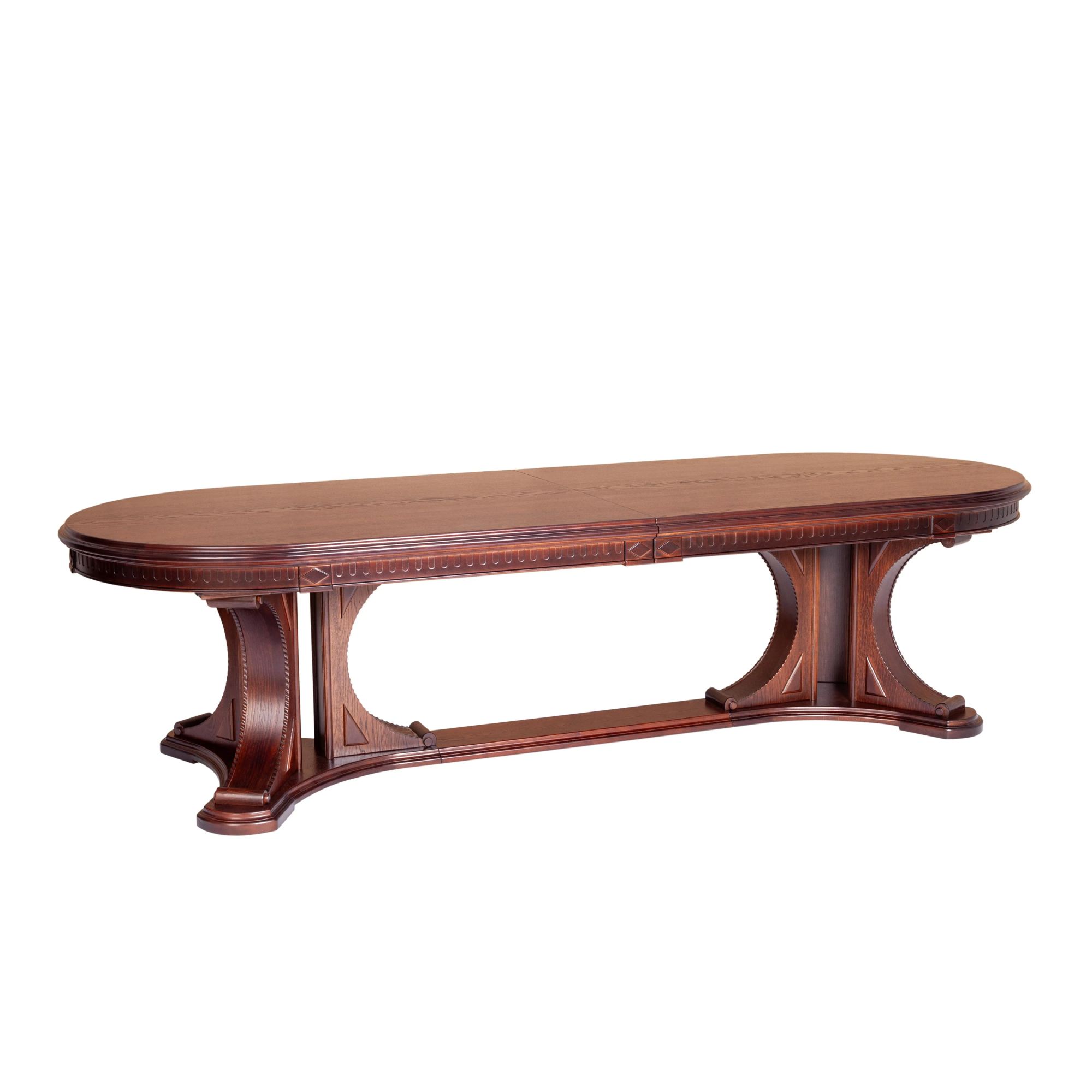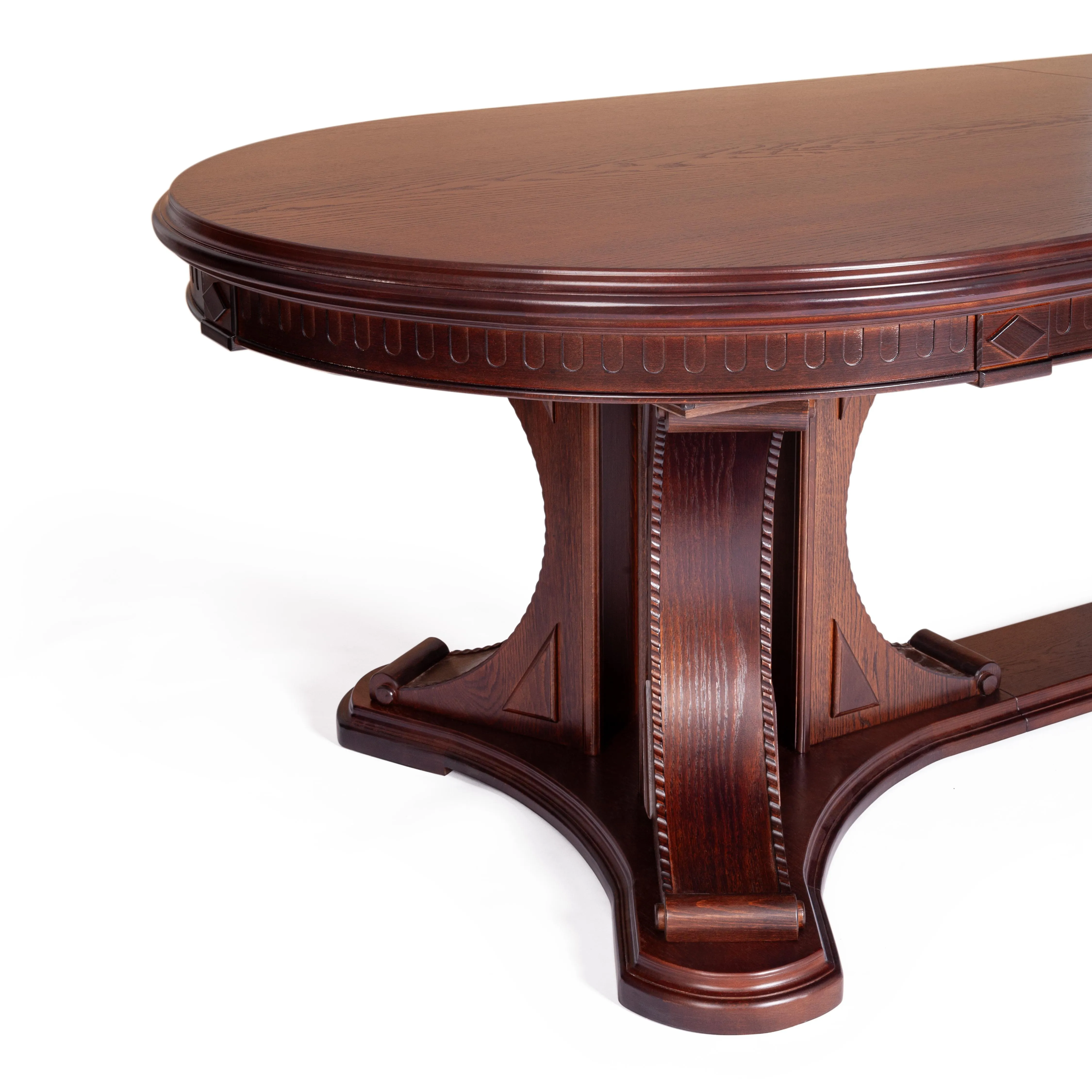 Необычный дизайн стола VERSAL добавит черты индивидуальности любому дому. Эта изысканная модель коричневого цвета (Tobacco) не просто деталь интерьера, а необходимый предмет мебели, без которого не обходится ни одна столовая или кухня. Благодаря двум внутренним вставкам обеденная зона может быть увеличена на 50 или 100 сантиметров в зависимости от ваших потребностей, за столом можно разместить от 8 до 12 человек.  Овальная столешница из МДФ, шпонированна дубом. Такое покрытие обеспечивает изделию прочность, износостойкость и устойчивость к деформации. Великолепные гнутые изящные опоры и декоративные элементы из массива бука придают столу особый шарм и элегантность. Модель не требует специального ухода, обладает долгим сроком службы и отличными эксплуатационными качествами. Овальный раздвижной стол VERSAL функционален и практичен, станет изысканным украшением любого интерьера. Его превосходное качество и великолепный внешний вид привнесут неповторимую атмосферу в обеденное пространство в вашем доме. Инструкция по сборке прилагается.