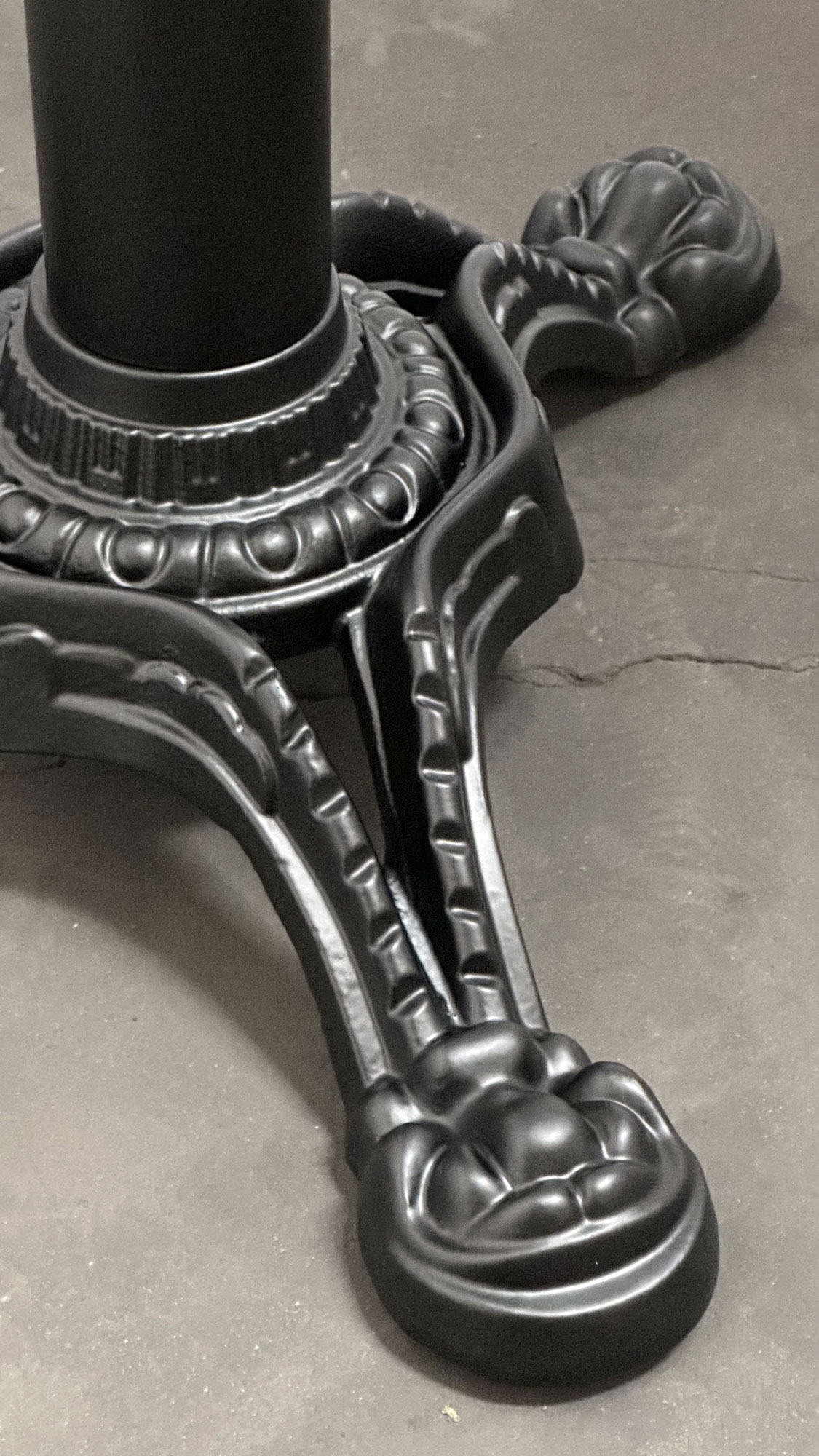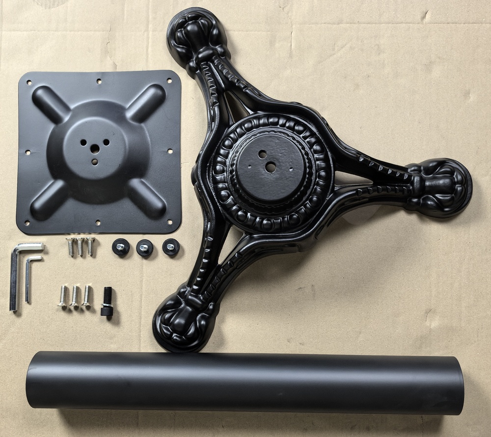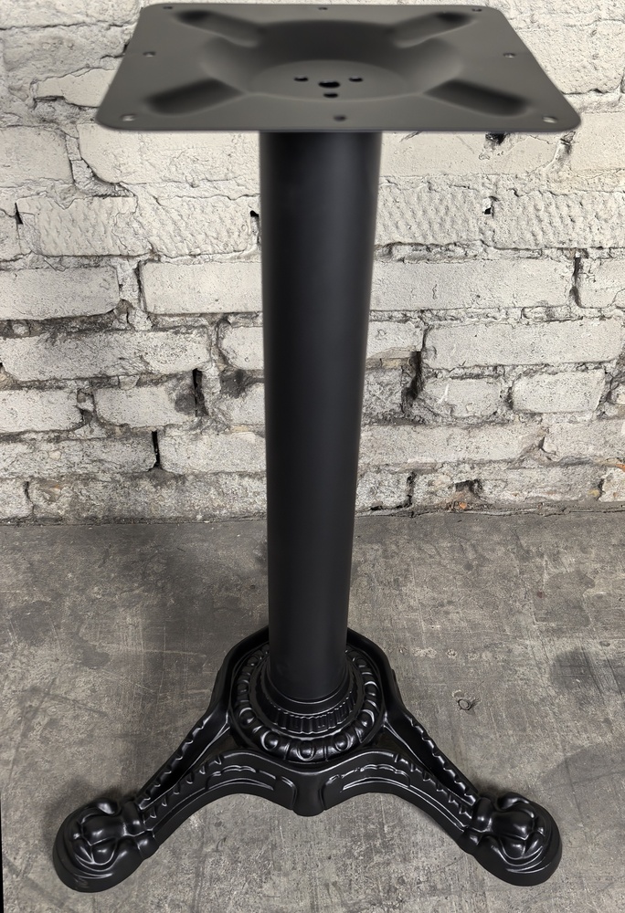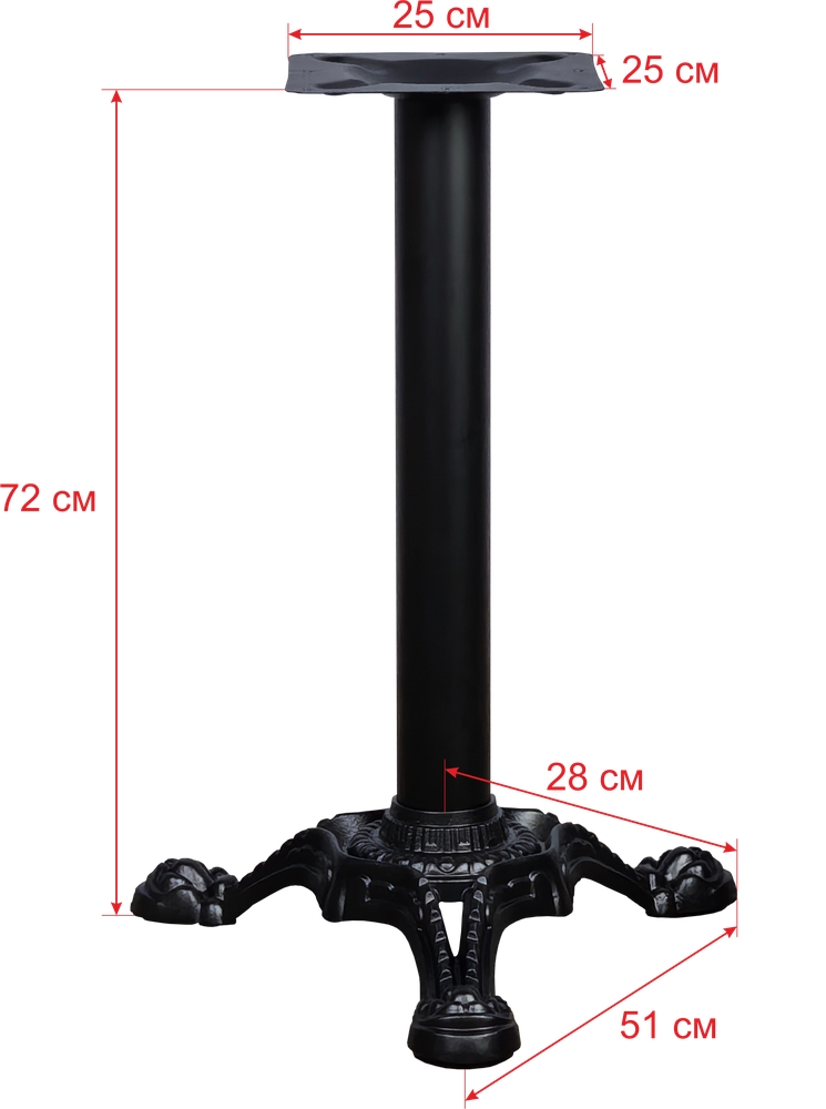 Подстолье чугунное. Труба - стальная. Основание - чугунное литье. Диаметр основания: 58 см, диаметр трубы: 7,6 см, размер верхней площадки: 25х25 см. Рекоменд. макс. размер столешницы - D-70. 70*70.
