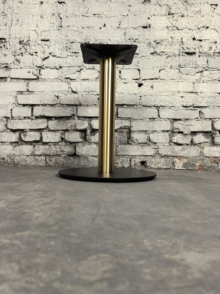 Подстолье металлическое. Основание - черное порошковое покрытие матовое. Труба - золотая матовая нержавейка (нитрид титана). Основание плоское. Рекомендуемый размер столешницы: Ø60.