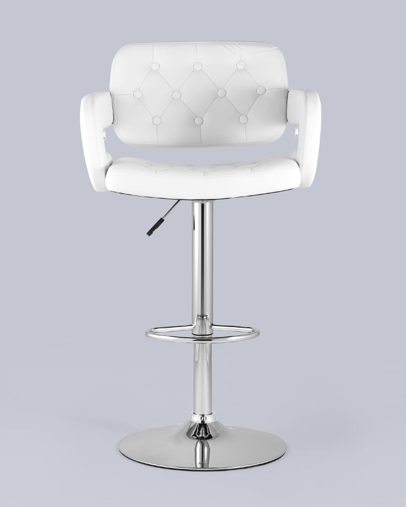 Для обивки сиденья барного стула использована PU-кожа – искусственный материал с высокой прочностью, износостойкостью и естественной фактурой. Каретная стяжка в оформлении спинки сиденья и белый цвет сочетаются с металлическим блеском гладкого хромированного основания. Высота сиденья регулируется от 62 до 83 сантиметров - можно подогнать под барную стойку или столешницу любого размера.