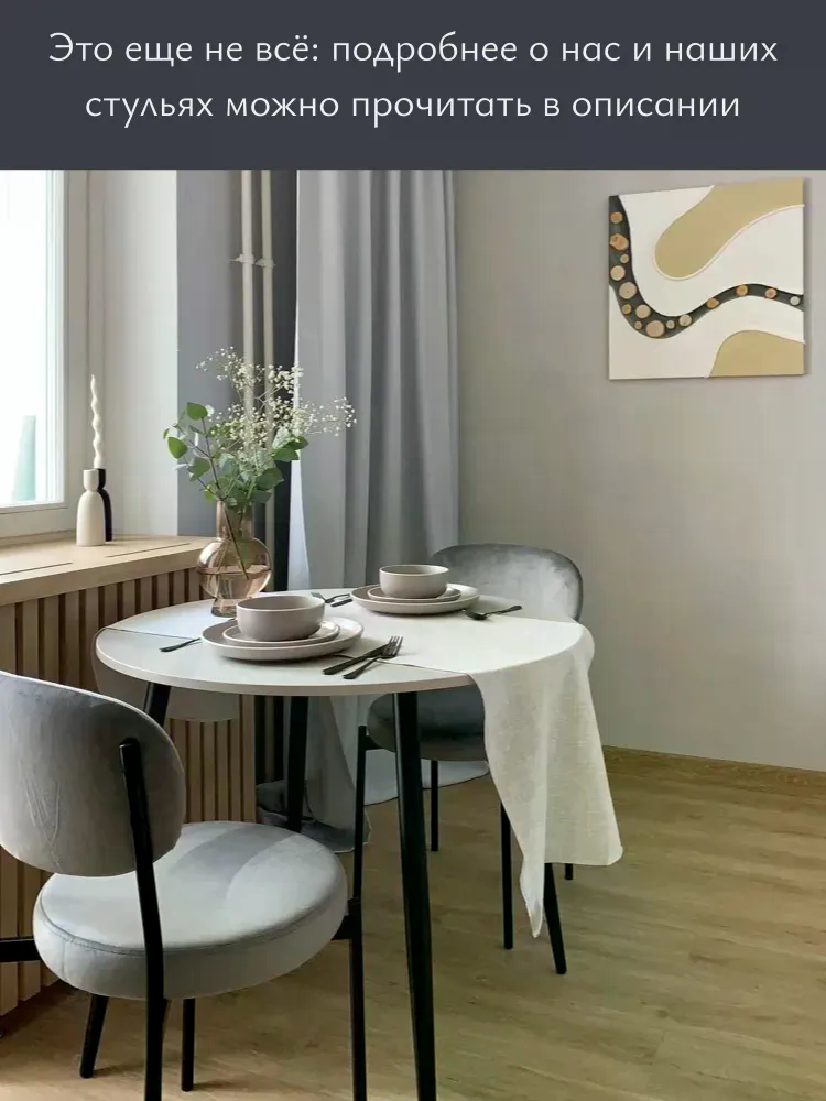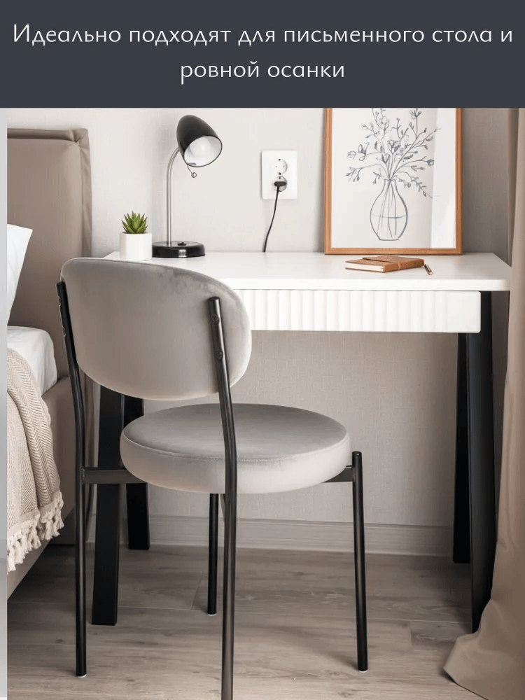 Прочная металлическая рама с тонкими линиями и воздушным дизайном обеспечивает долговечность и устойчивость, а дополнительная пластина усиливает место пересечения ножек для максимальной надёжности. Отдельное круглое сиденье и овальная спинка создают современный скандинавский образ, который дополняет интерьер в стиле минимализма.