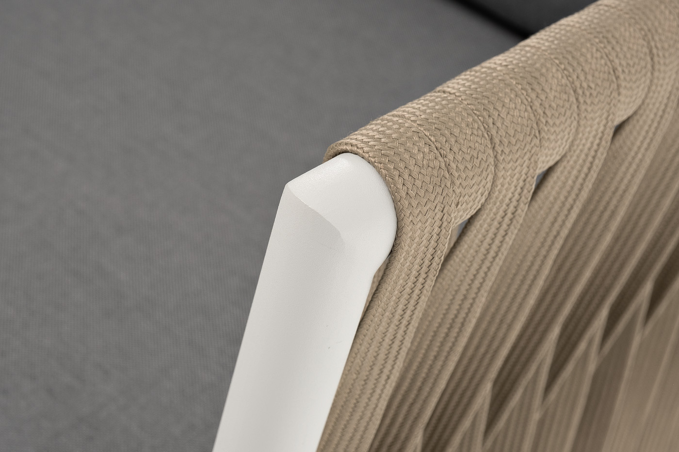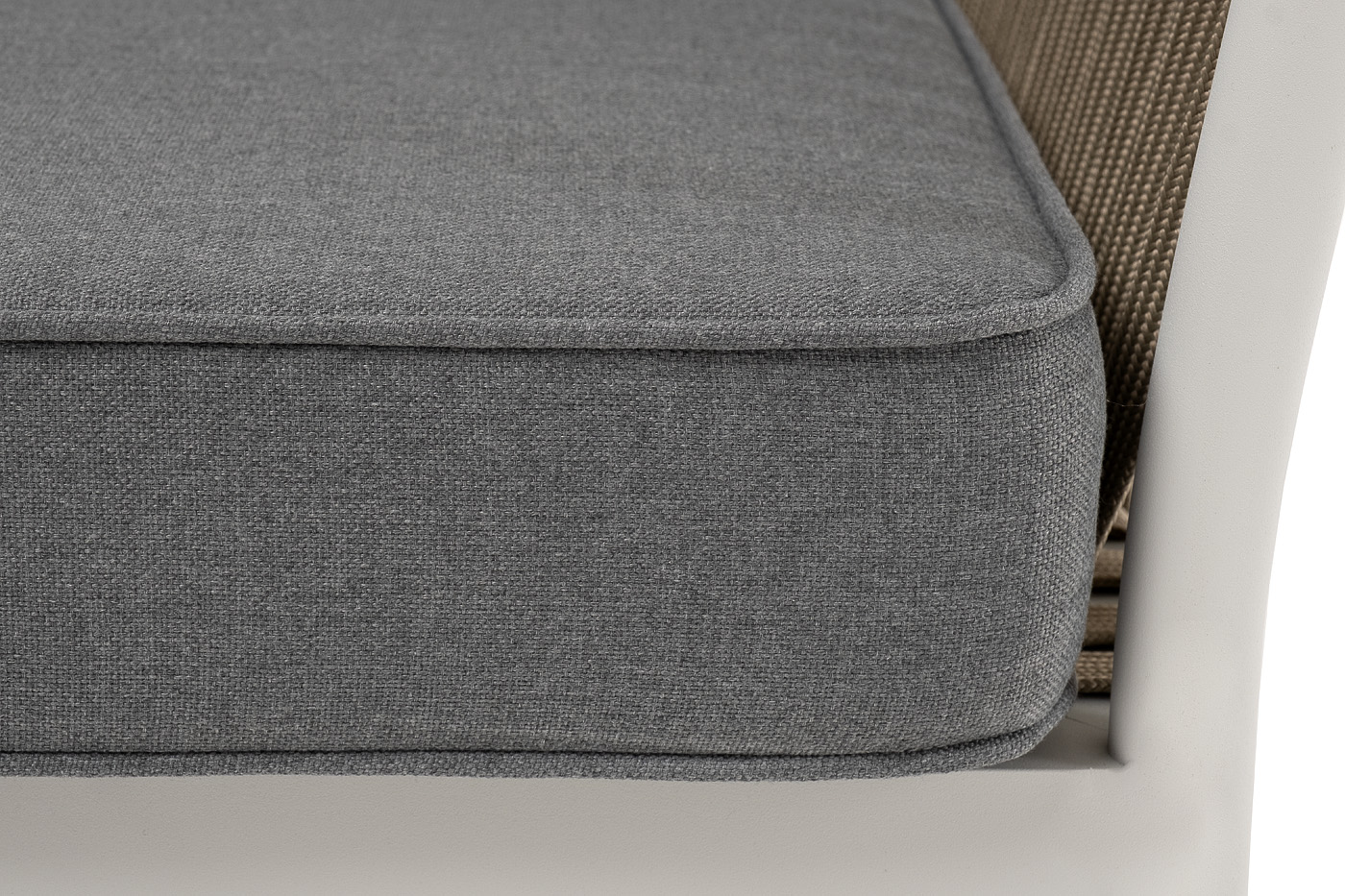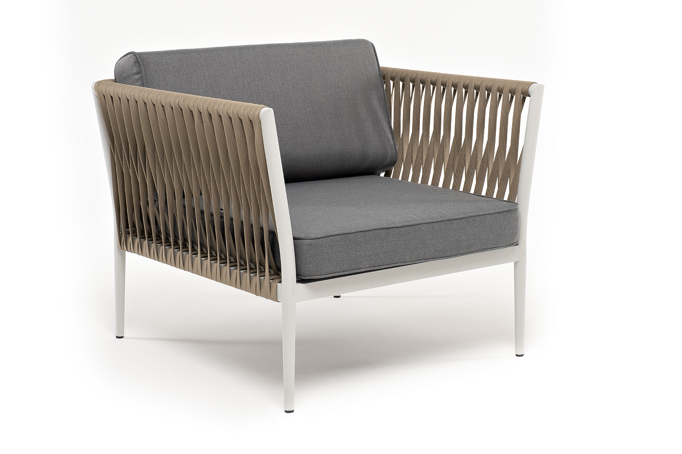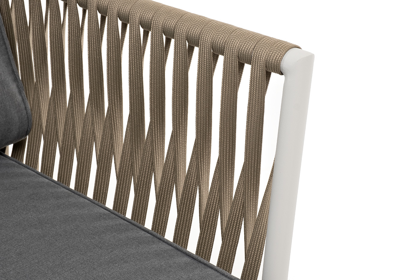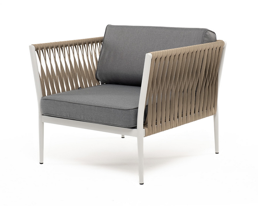 Кресло имеет алюминиевый каркас, окрашенный порошковой краской в светло-серый (RAL7035) цвет. Боковины каркаса вручную оплетены роупом - эластичными синтетическими лентами, изготовленными из высокопрочных полиэфирных волокон. Цвет оплетки - серо-коричневый.
